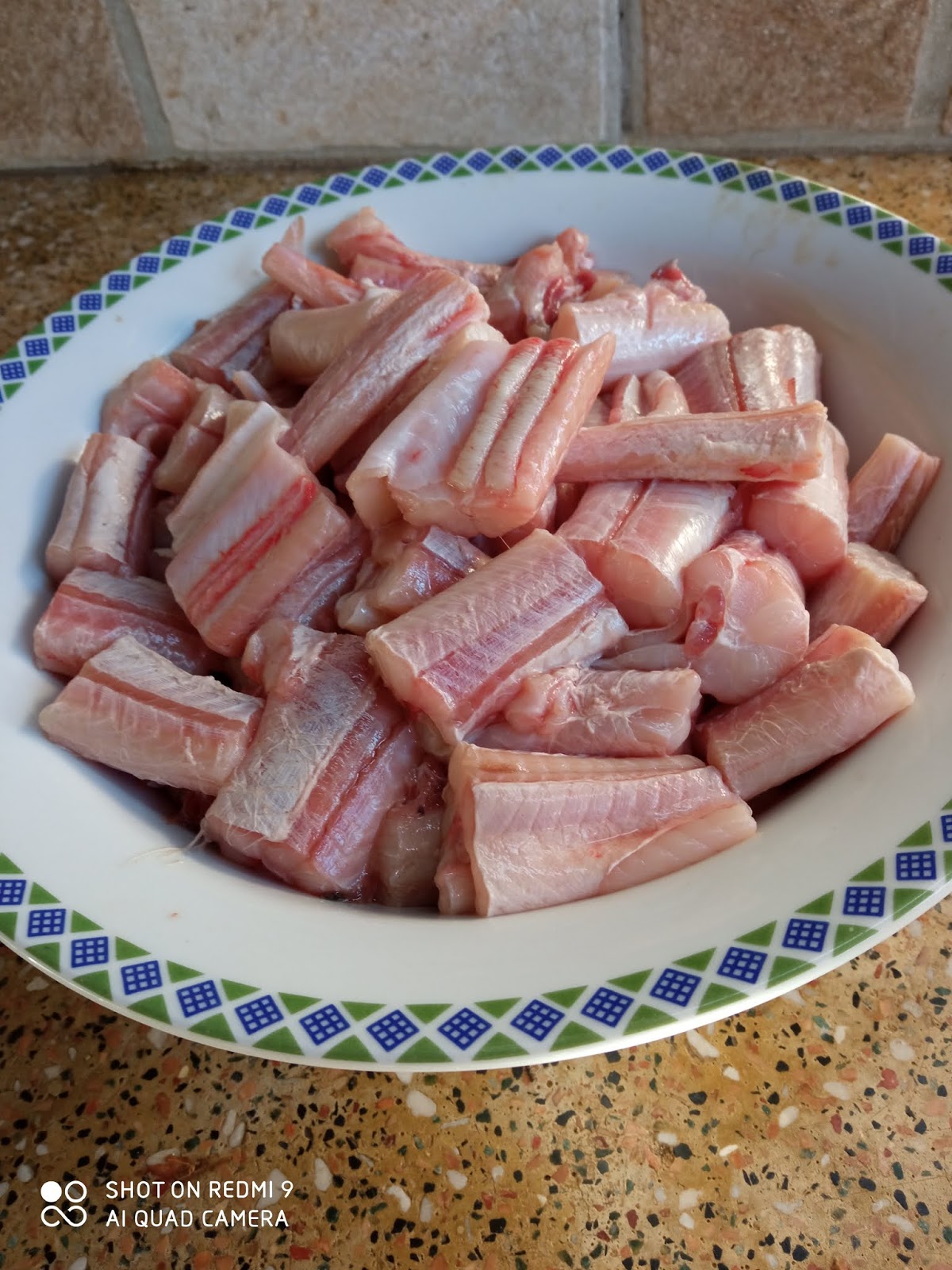 un chilo e mezzo abbondante di gattucci, privati della pelle e tagliati a tocchetti, mettere da parte i fegatini per fare il soffritto.